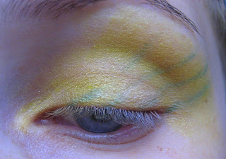 Meikissä käytetty: ( vasemmalta ylhäältä) Loreal ColorAppealTrioPro 316 Platinum Rose, Gosh Effect Powder 09 Holographic Silver, Loreal ColorAppealTrioPro 408 Night&Day Black, Maybelline Pure Foundation Mineral 04 Vanilla Rose, (alhaalta vasemmalta) Kanebo Concealer 02 Medium, MakeUpStore Cyber Shadow Neon, MakeUpStore glitteri Smaragde, WetnWild CoverAll ConcealerPalette.